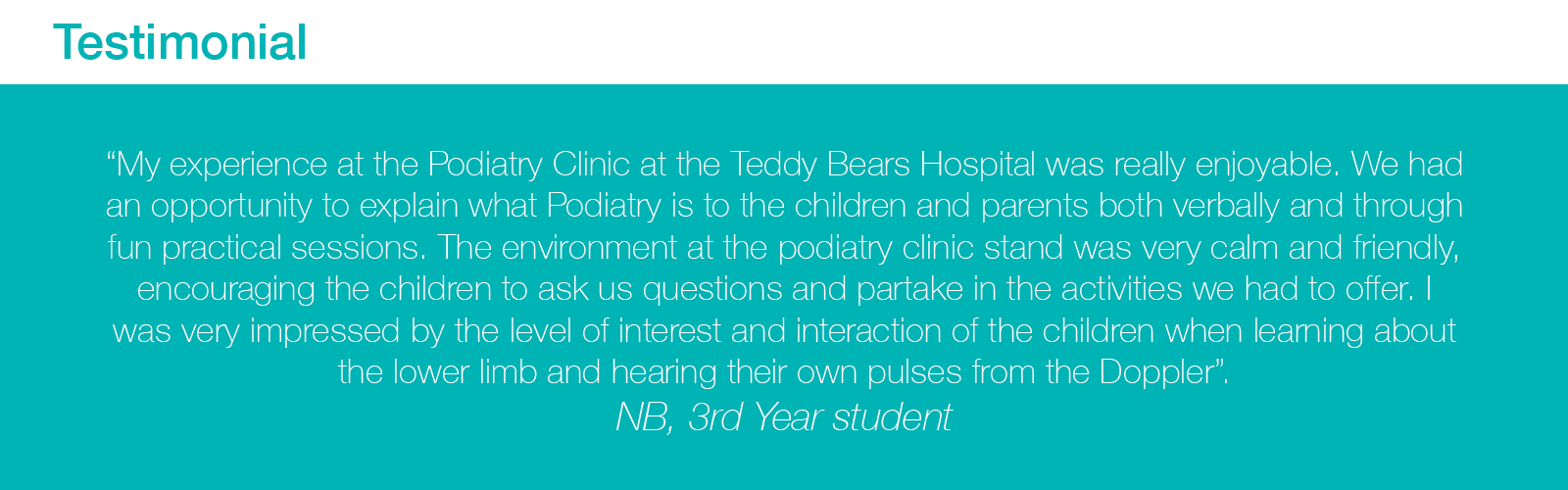 A Podiatry Clinic was set up at The Teddy Bears Hospital as an opportunity to show what podiatrists do and increase public awareness of the scope of practice of the podiatric medicine profession and the Podiatric Medicine education available at NUIG. A fun, interactive clinic environment was set up encouraging the kids attending the Science Fair to listen to the blood flow in their lower legs and feet – “The Beat in Their Feet”, make a carbon copy of their footprint and learn about how the blood flows around their body and gain an understanding of the importance of keeping your feet healthy. The relaxed and fun environment aimed to make kids and their parents more comfortable and less intimidated in a clinical setting and reduce the anxiety some people experience when meeting health professionals.