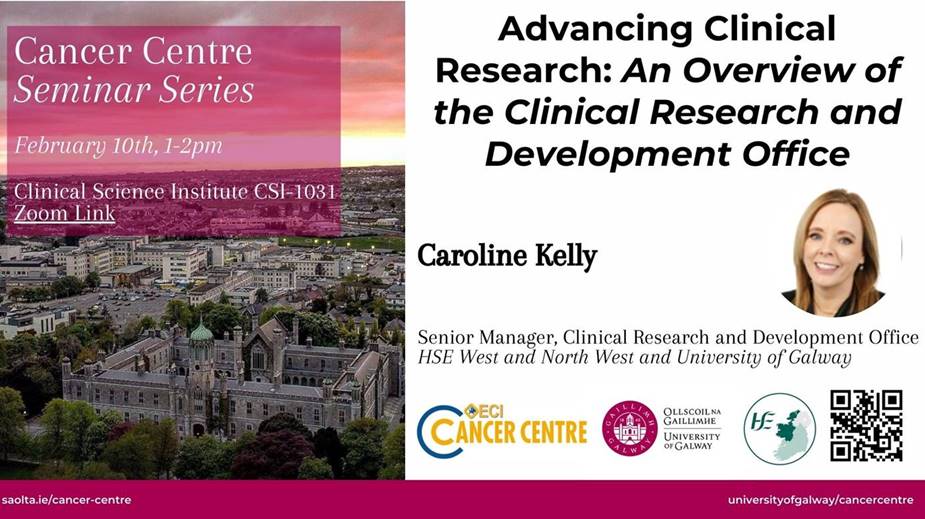 The Cancer Centre Seminar Series resumes Monday February 10th at 1pm with Caroline Kelly, Senior Manager CRDO, presenting "Advancing Clinical Research: An Overview of the Clinical Research and Development Office".