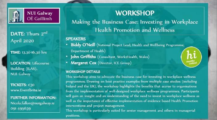 Our workshop speakers, Biddy O'Neill (Department of Health), John Griffiths (Work2Health ltd) and Margaret Cox (Director of I.C.E. Group & Pitman Training), will advocate for the business case for investing in workplace wellness programmes. Drawing on best practice from multiple case studies (including Ireland and the UK), the workshop highlights the business benefits that can be gained from well-designed wellness programmes.