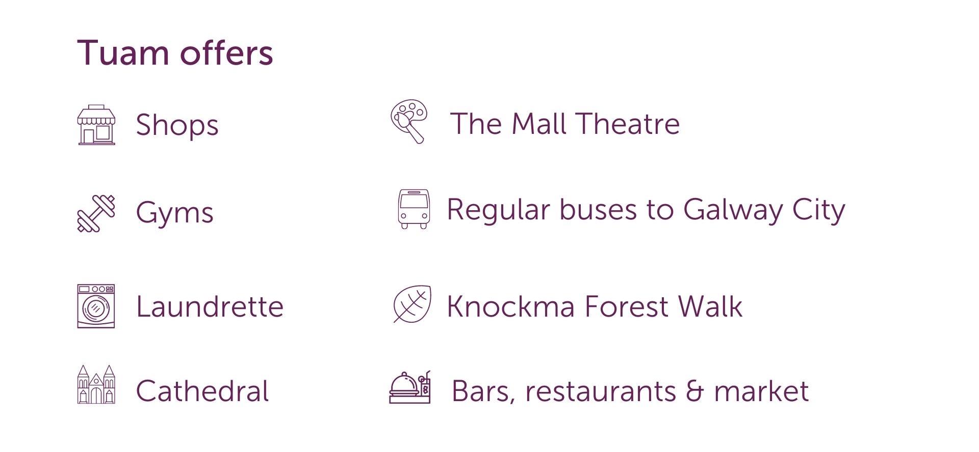 Although Tuam is the furthest out (33.4 km from Galway City ), the town offers good amenities and scenic surroundings.