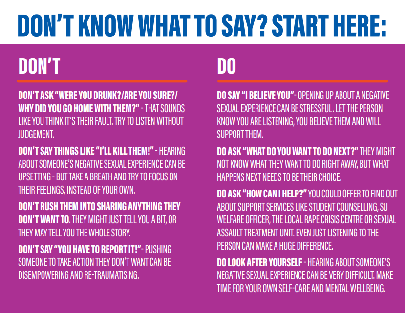 Quick tips for supporting a student or colleague if they disclose a negative sexual experience to you